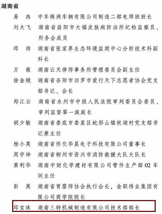 為表彰先進(jìn)、樹(shù)立榜樣,進(jìn)一步引領(lǐng)和激勵(lì)廣大婦女堅(jiān)定不移聽(tīng)黨話(huà)、跟黨奮進(jìn)新征程,豪情滿(mǎn)懷、意氣風(fēng)發(fā)投入推進(jìn)中國(guó)式現(xiàn)代化的偉大實(shí)踐,日前,全國(guó)婦聯(lián)決定授予10人全國(guó)三八紅旗手標(biāo)兵稱(chēng)號(hào),298人全國(guó)三八紅旗手稱(chēng)號(hào),授予199個(gè)單位全國(guó)三八紅旗集體稱(chēng)號(hào),其中,來(lái)自桃源的湖南三特機(jī)械制造有限公司技術(shù)部部長(zhǎng) 邱寶珠 獲得全國(guó)三八紅旗手榮譽(yù)。